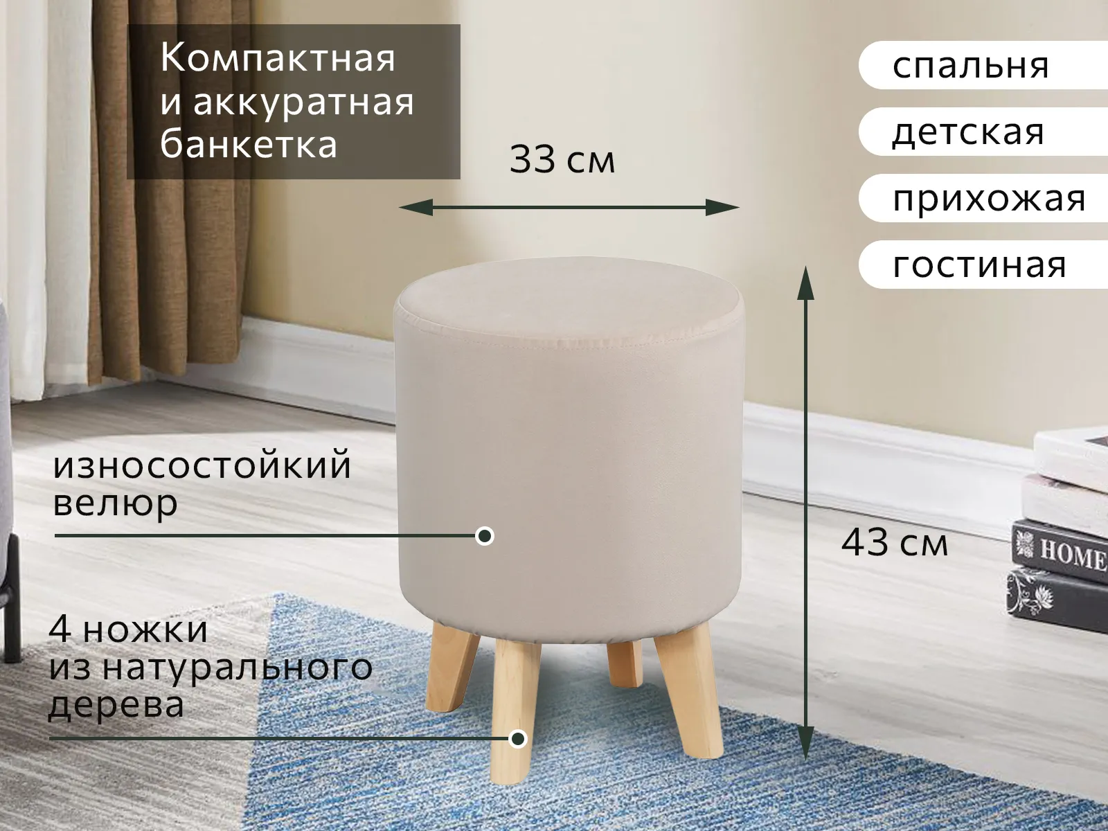 Круглая банкетка на ножках - это удобный и стильный предмет мебели, который может быть использован как место для сидения или как прикроватный пуфик. Она выполнена из ткани, что позволяет ей быть мягкой и удобной для сидения.