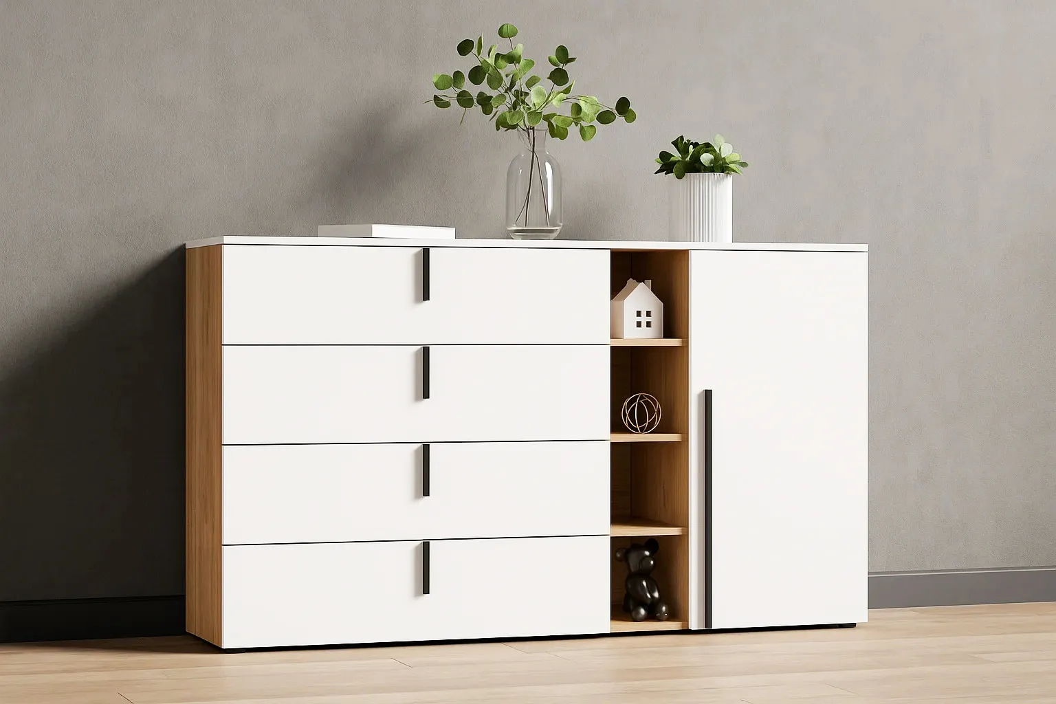 Внутри комода пространство разделено на 3 секции, в левой находится 4 ящика на шариковых направляющих. Средняя секция - открытая с полками. Правая секция закрыта распашной дверью, за которой расположены 2 стационарные полки.