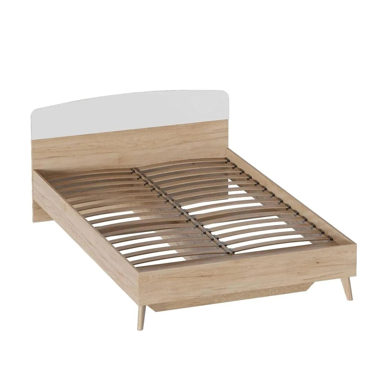 Корпус изготовлен из ЛДСП толщиной 16 мм в цвет натурального дуба, белая накладка в изголовье - из МДФ толщиной 16 мм. Опоры сделаны из натурального массива березы. Высота опор 25 см. Высота спального места 38 см. Рекомендуемая высота матраса 16-25 см. В комплект кровати входит прочное ортопедическое основание на березовых ламелях. Максимальная нагрузка на одно спальное место составляет 150 кг.