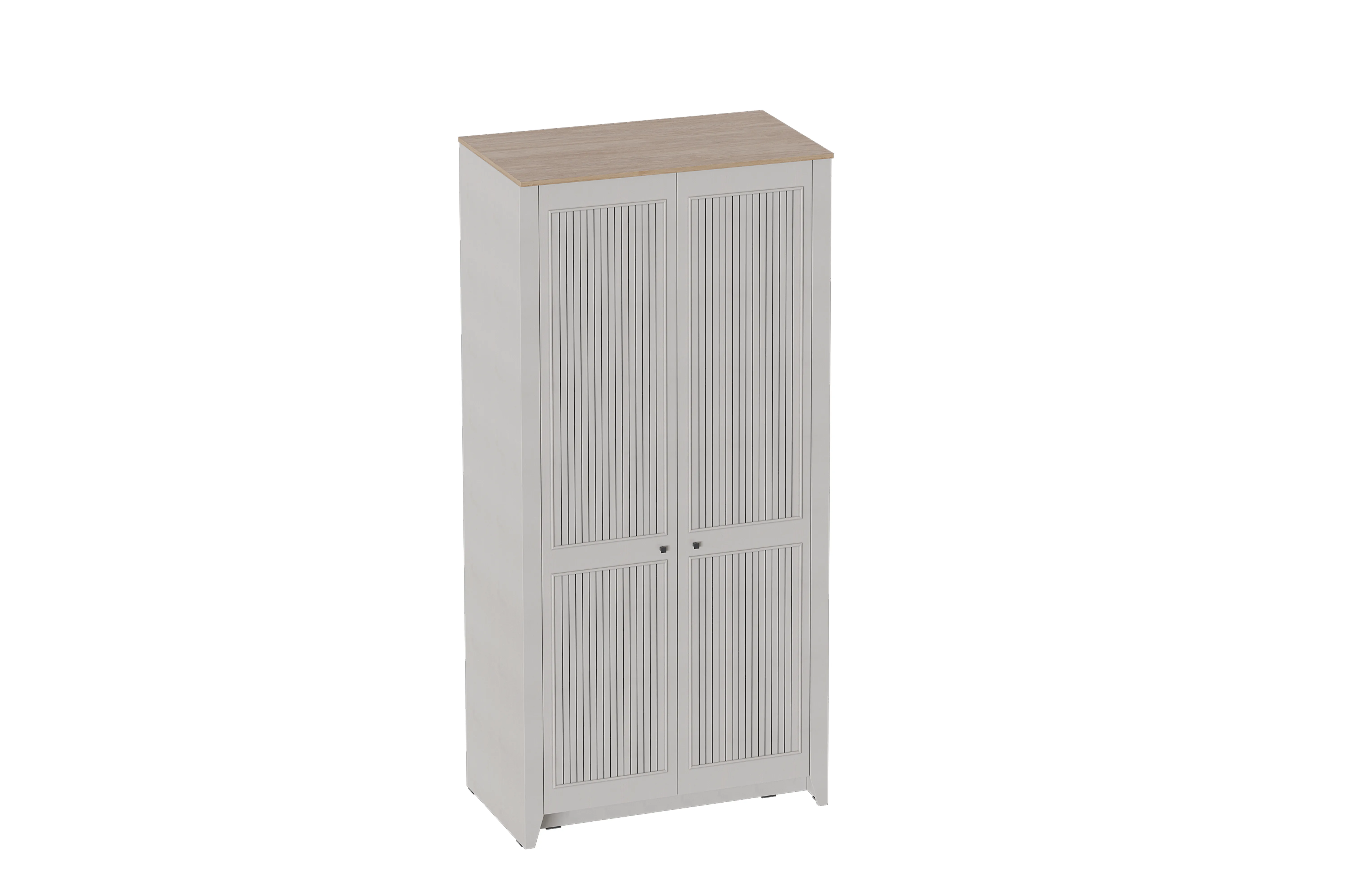УФ-фотопечать полосок на фасадах в обрамлении пластиковых молдингов придает изделию оригинальный стиль современной классики. В центральной части шкафа расположена штанга для одежды, а также верхняя и нижняя полки. Задняя стенка шкафа изготовлена из ХДФ. На опорах размещены войлочные подпятники.