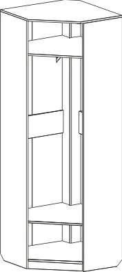Угловой шкаф оснащен двумя отделениями: для белья с четырьмя жёсткими полками; платяное с жесткой полкой и продольной стальной штангой. В колпаке шкафа имеется паз для светильника, входящего в комплект. Блок питания приобретается отдельно, и рассчитан на подключение шести светильников.