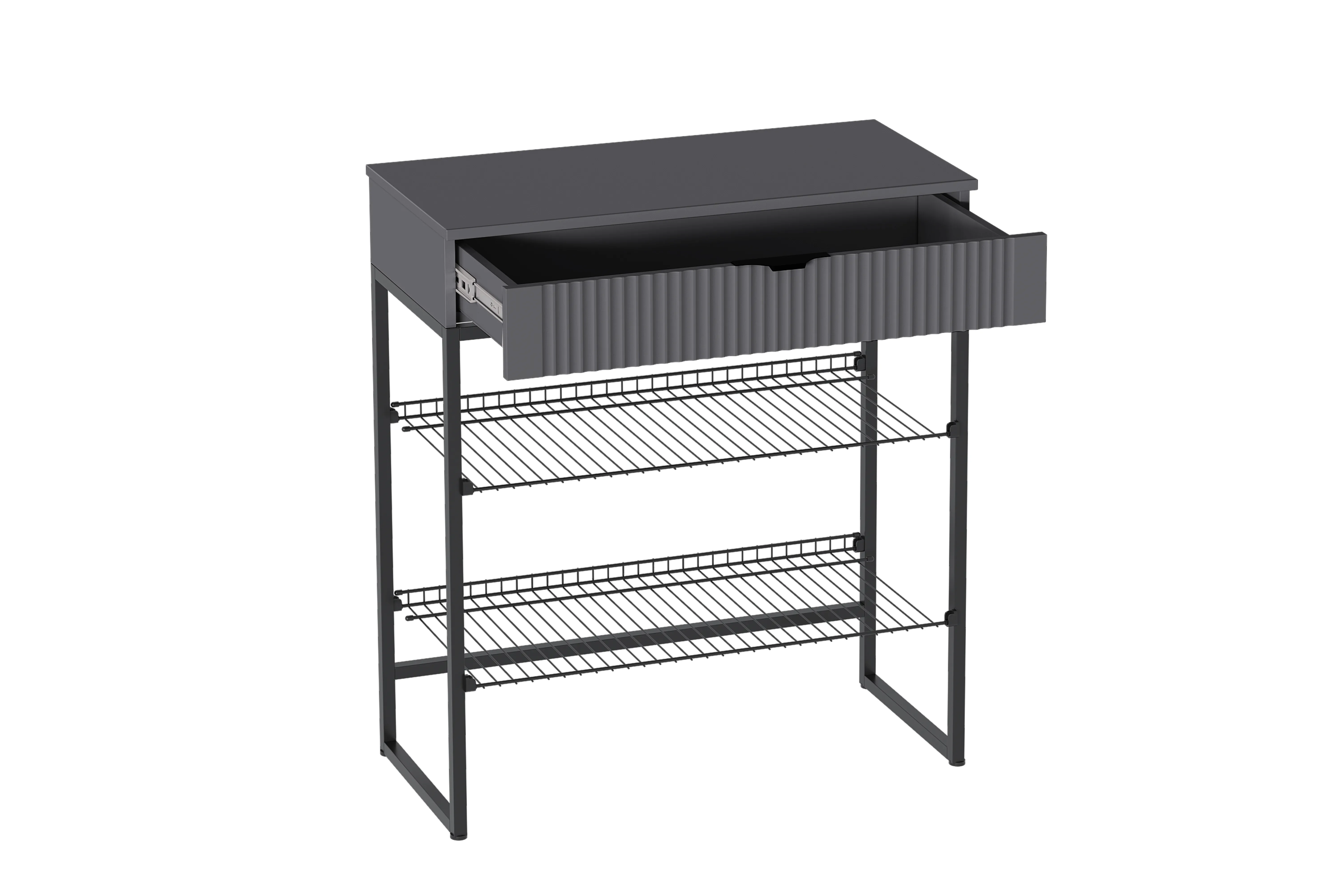 Тумба для обуви "Нора" состоит из несущего металлического каркаса и закрепленного к нему корпуса из ЛДСП , внутри которого установлен выдвижной ящик на шариковых направляющих с доводчиками. Между боковыми металлическими рамами закрепляются стальные сетки для хранения обуви.