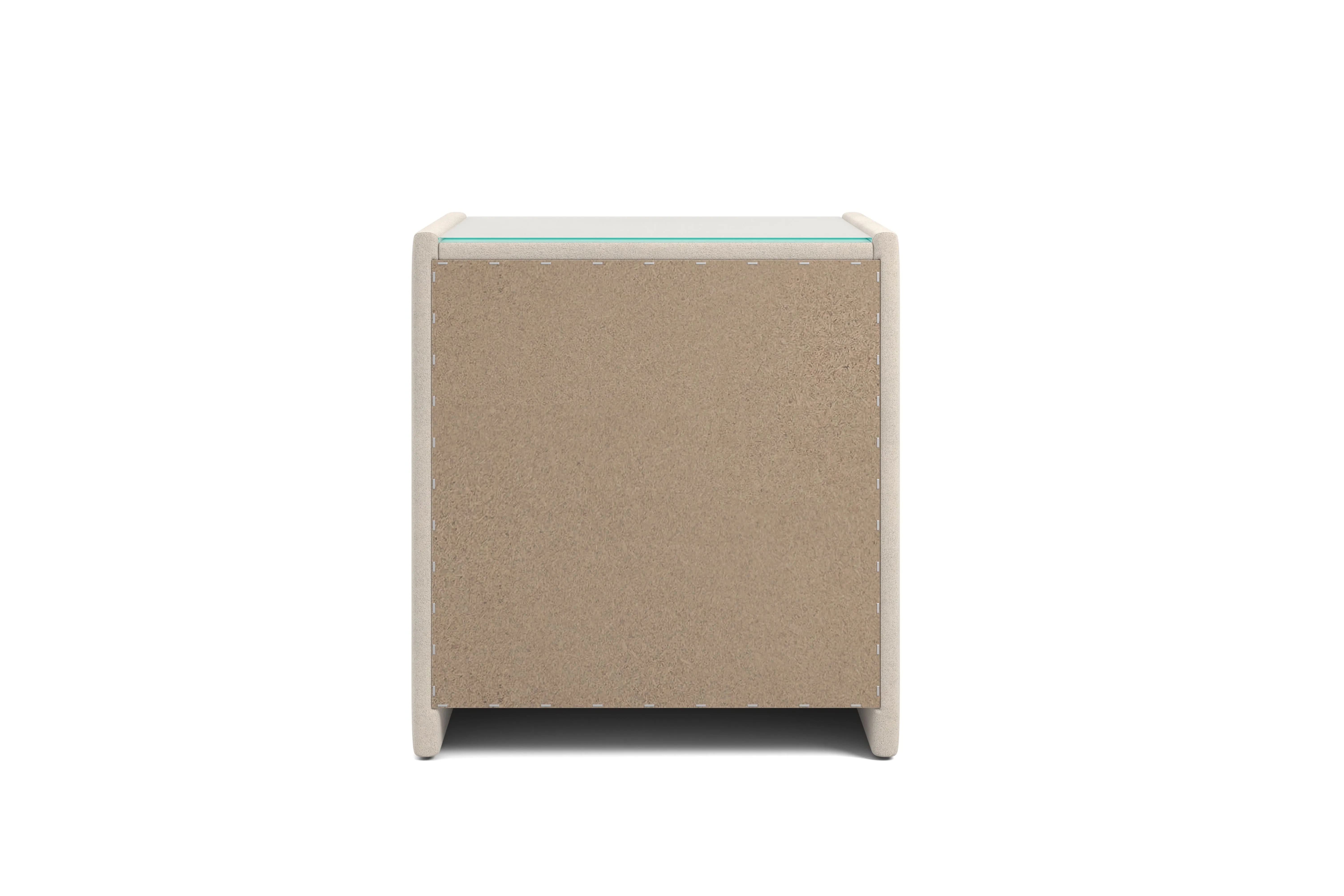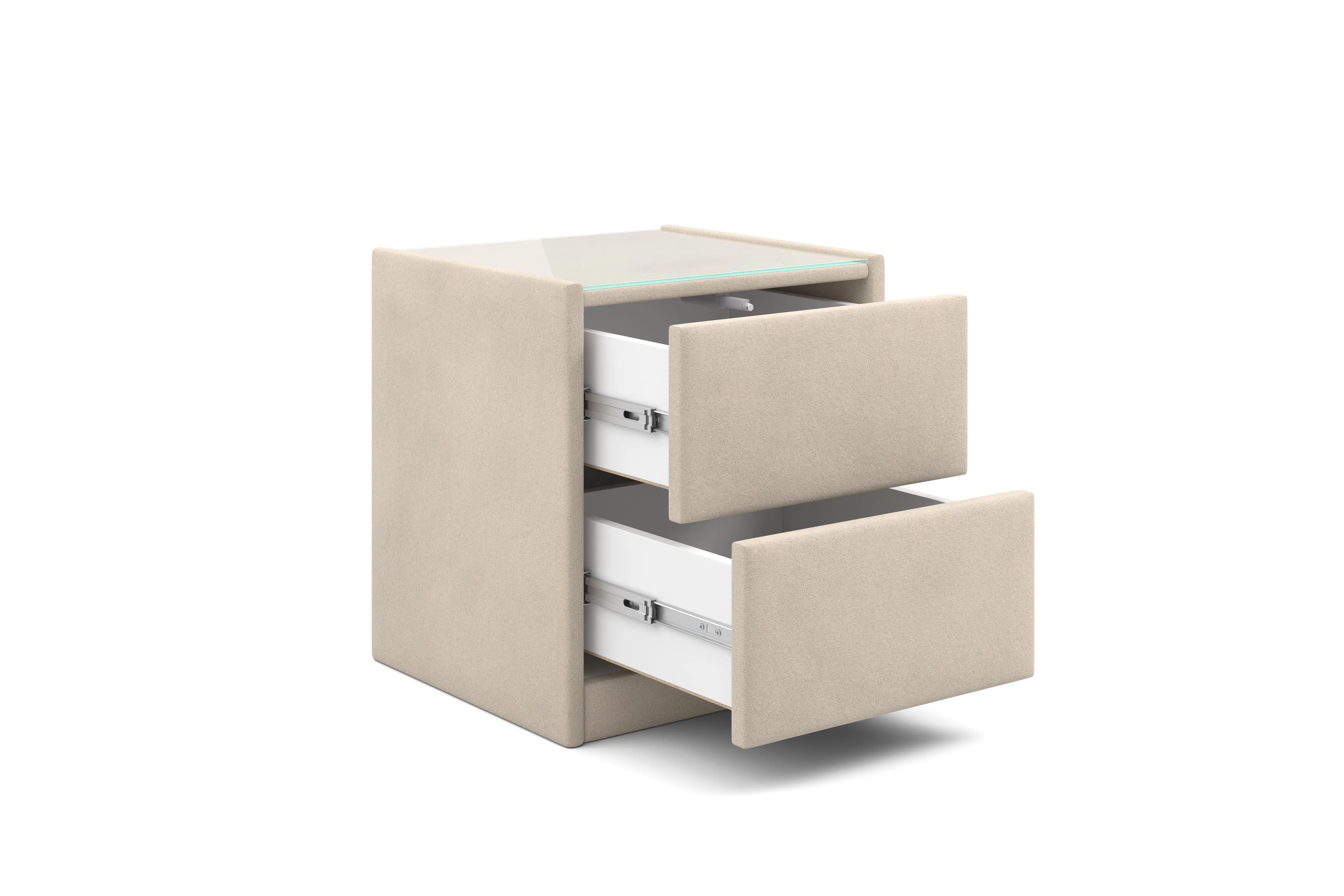 Тумба обтянута высококачественным велюром, что придает ей особый уют и комфорт. Имеет стеклянную столешницу и два вместительных выдвижных ящика с механизмом Push to open. Скругленные торцы модели, минимизируют риск удариться в темноте.