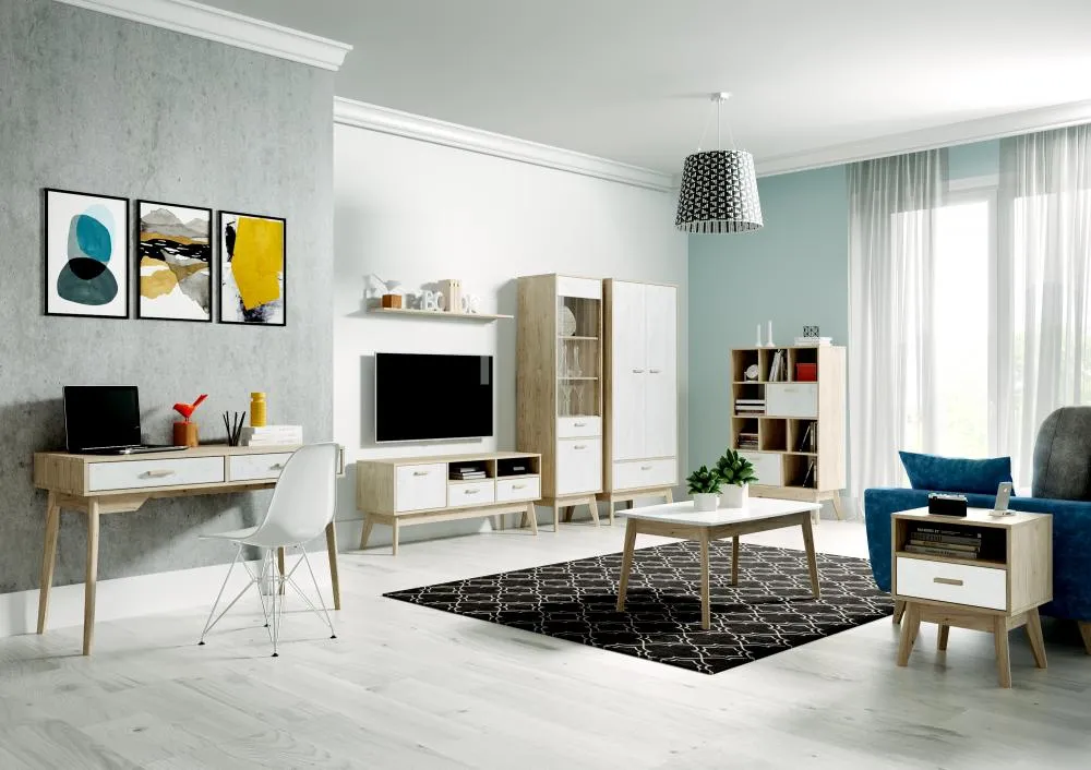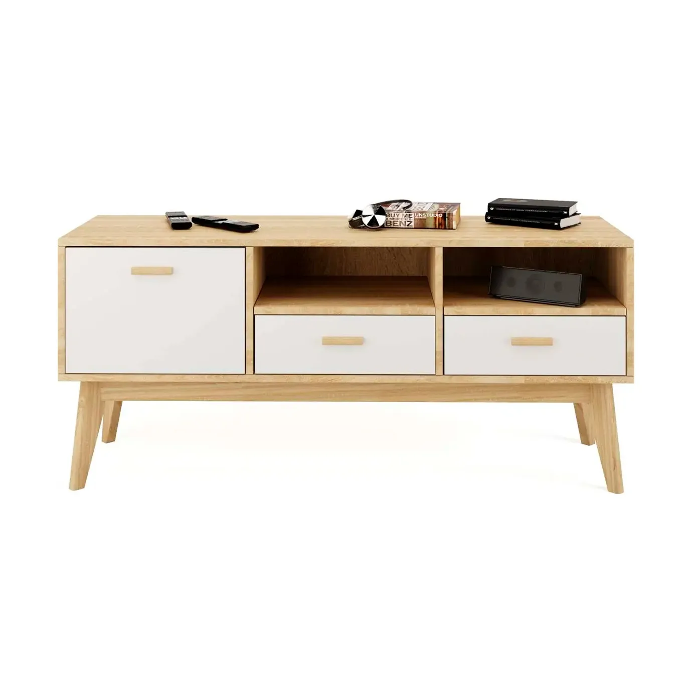 Упорядочить хранение сопутствующих аксессуаров и компонентов домашнего кинотеатра помогут выдвижные ящики с фасадами из белоснежного МДФ, секция с распашной дверцей и открытые ниши. Корпус изделия выполнен из ЛДСП, высокие стильные опоры и ручки - из массива березы.