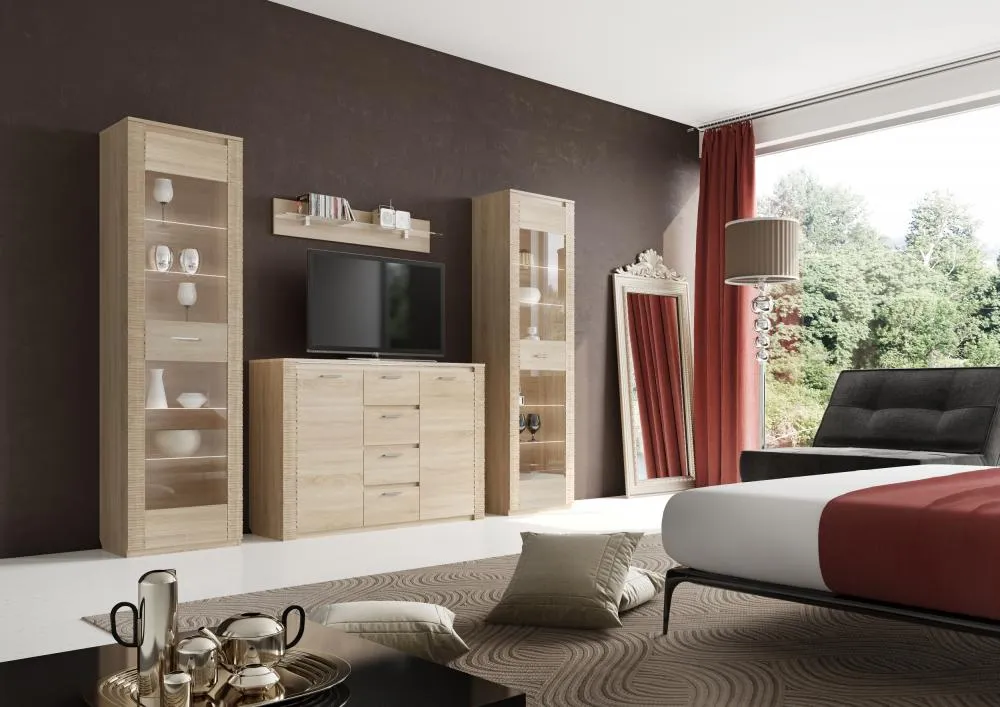 В витрине за общей стеклянной дверцей располагаются выдвижной ящик, четыре стеклянные и одна жёсткая полка. Четыре светильника «HLT Prismatic FT» для подсветки полок и блок питания в стандартную комплектацию не входят и приобретаются отдельно.